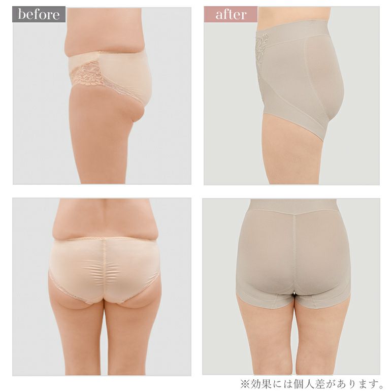 ヒップ中心に施したテープとギャザーがヒップを引き上げ丸みのあるラインを作ります。さらにバックは、ヒップ下からサイド、ウエストに向かって一体型になって引き上げる「ハート尻パネル」と、身生地と下垂防止パネルの三重構造で、流れたお尻のお肉を集めて上向きの美尻を作ります。