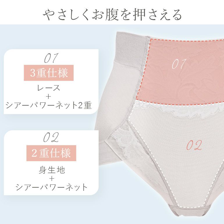 フロント下腹周りは、身生地・シアーパワーネットの二重構造。程よい伸縮性で、効果的にお腹を押さえ、すっきりカバーします。