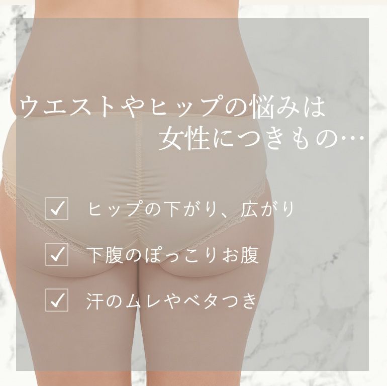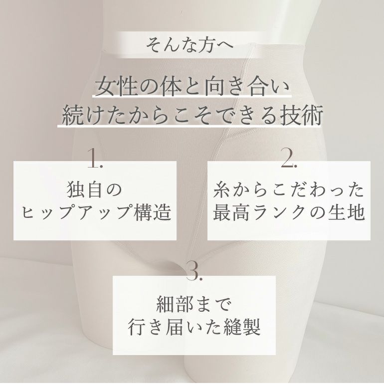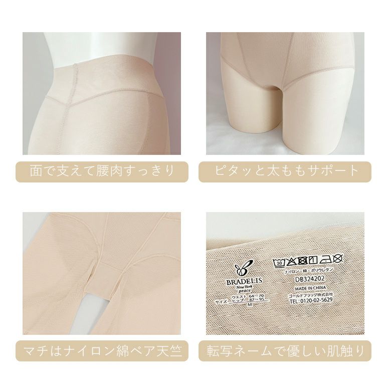 さらにヒップ下側からウエストに向かってパワーネットを裏打ちした設計で、ヒップを持ち上げてお尻と太ももとの境目を作ります。
