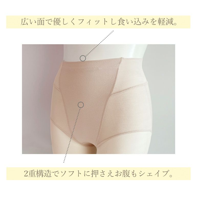 - 身生地にメッシュ素材を裏打ちした二重構造で気になるお腹のシルエットをすっきり整えます。
