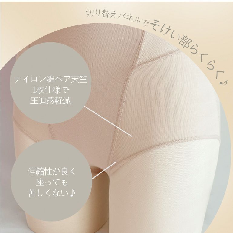 - ウエストのサイドから後ろの幅広パネルは、綿混パワーネット*ヘム素材を二重に折り返したわさ仕様*。サポート力のある素材が面でフィットし、腰肉をカバーします。