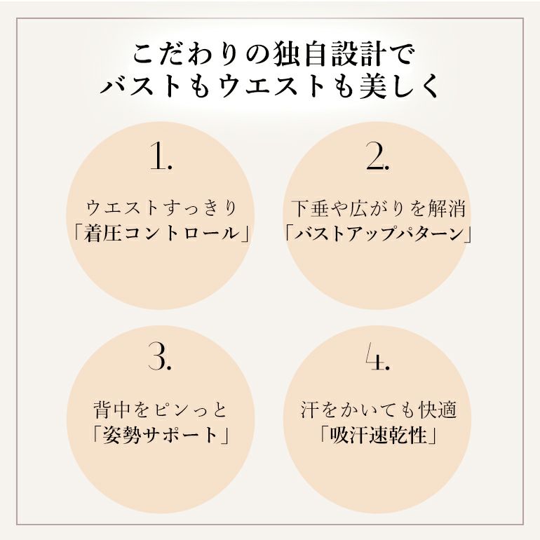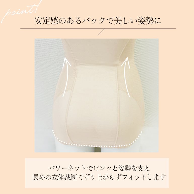 また、バックは三枚接ぎ仕様で、背筋に沿ってぴったりフィットし美しい姿勢をサポート。着丈を長めに設定することで、お尻の丸みを潰さず、ずれ上がりを軽減します。