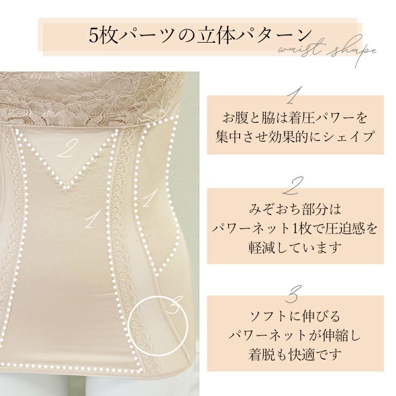 フロントは五枚接ぎの立体パターンで、着圧を分散。お腹周りや脇から腰にかけてサイドのお肉をすっきりと押さえ、きゅっとしたウエストラインを作り、段差も解消します。