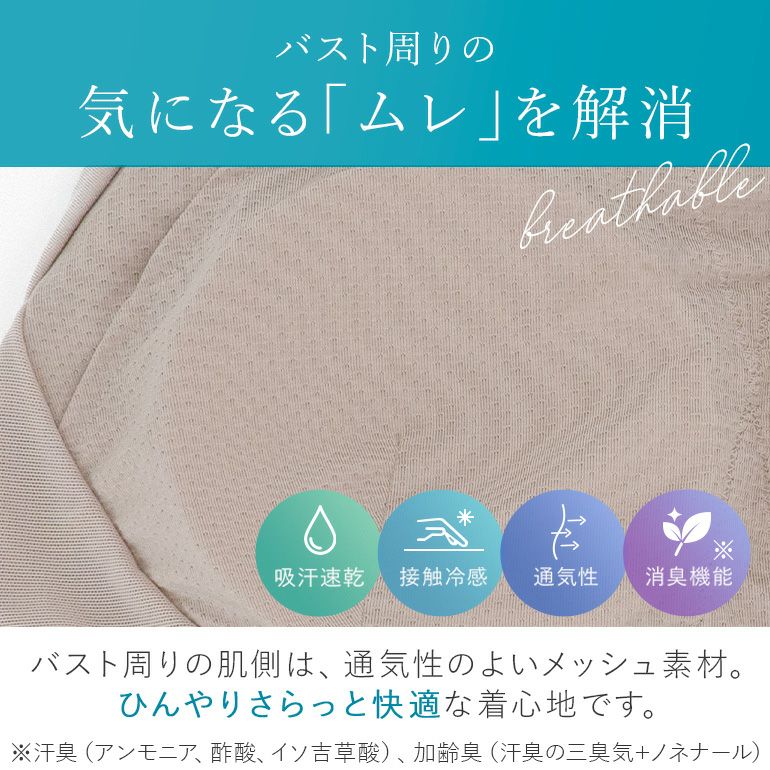 吸汗性・速乾性・通気性に優れているのでムレにくく、汗臭・加齢臭の消臭機能付きで汗ばむ季節も快適にお過ごしいただけます。