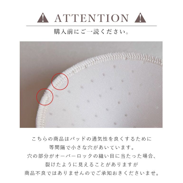 - 取り外し可能な穴あき丸パッドで着用中のムレを軽減。空気が通りやすい粗めメッシュ素材にリニューアルし、バスト周りを快適に。