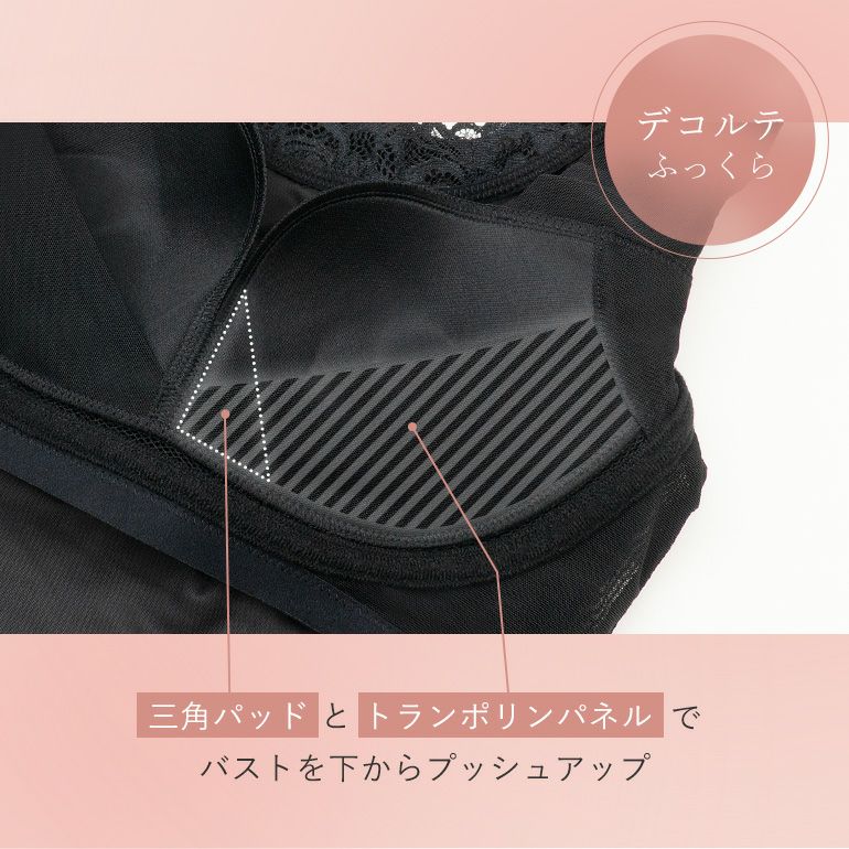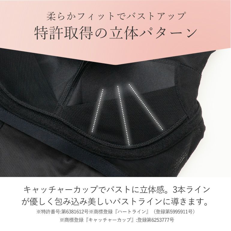 カップ内側の「トランポリンパネル」が、横に広がったバストを中心に寄せ、高いトップ位置をキープ。さらに、バージスラインに沿った「引き上げループ」が、下からしっかりとバストを持ち上げます。