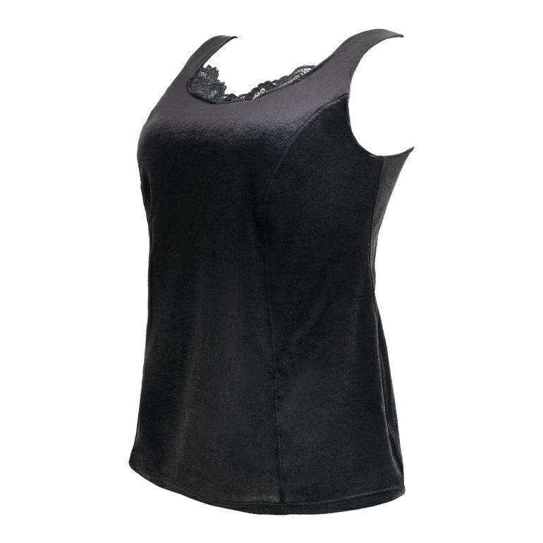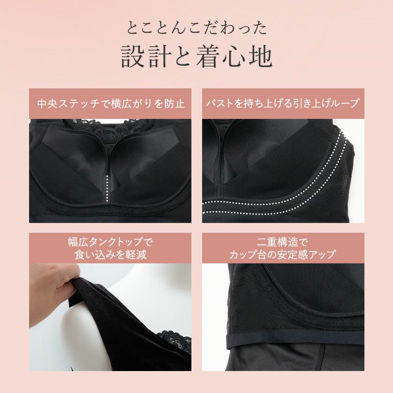 艶やかな光沢を放つストレッチベロア*素材を贅沢に使用した、高級感のある補整ブラキャミソール。ビスチェ風の切り替えと、繊細な二浴染め*レースが織りなすデザインは、インナーとしてはもちろん、ジャケットやカーディガンを羽織ってアウターライクにも着用いただけます。