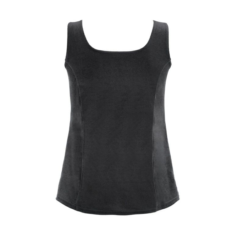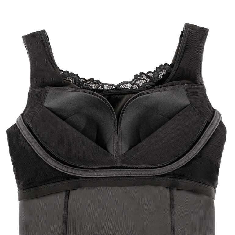 身生地には、滑らかな肌触りのストレッチベロア*を使用。伸縮性に優れ、締めつけ感が少なく快適な着心地です。ボディラインに美しく沿うプリンセスラインの切り替えが、体型をカバーしながら細見えもかなえます。