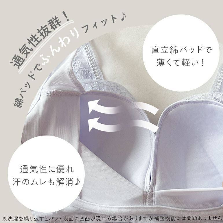 また、カップ周りの独自の補整機能で、左右からバストを中心に寄せて横広がりを軽減し、ノンワイヤーでも丸みのある美しいバストシルエットをつくります。