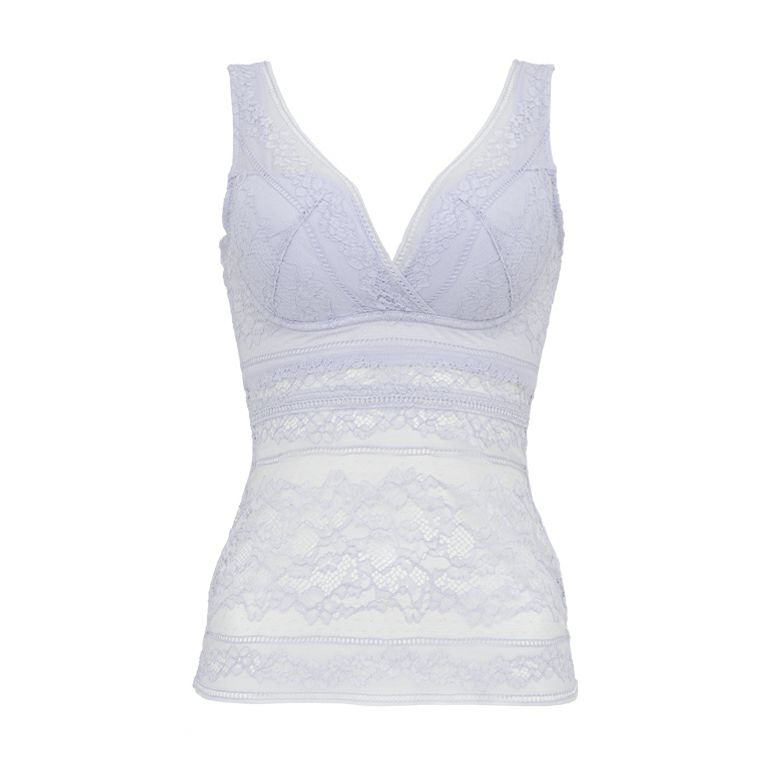 直線状のスカラと花柄を組み合わせた、トレンド感のあるストレッチラッセルレース*を使用した、アウターライクなデザインの補整ノンワイヤーブラキャミです。