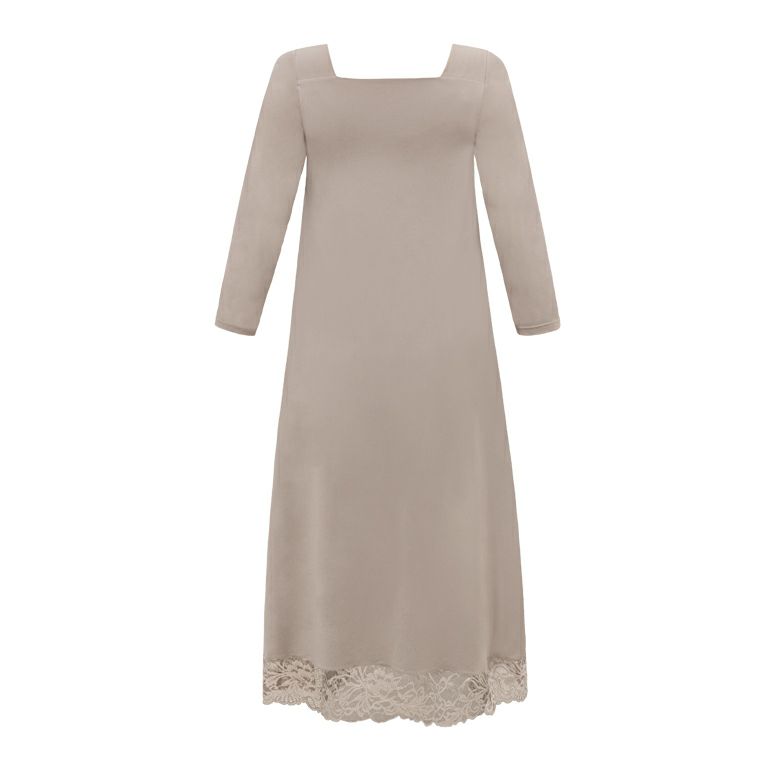 七分袖で腕をスッキリ見せ、ミモレ丈でふくらはぎを上品にカバー。ゆるやかなAラインが、お腹やお尻を自然に包み込みます。季節やシーンを問わずお召しいただけるデザインです。