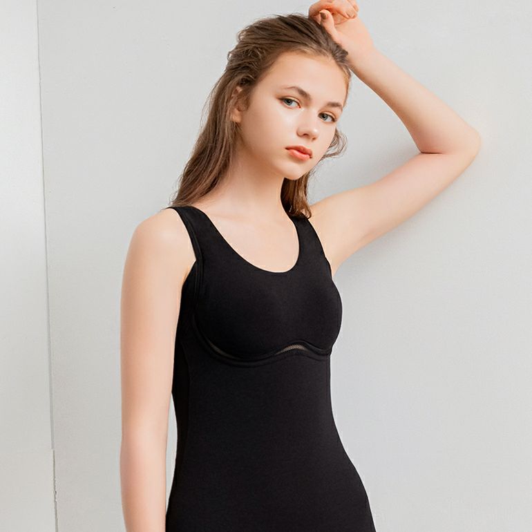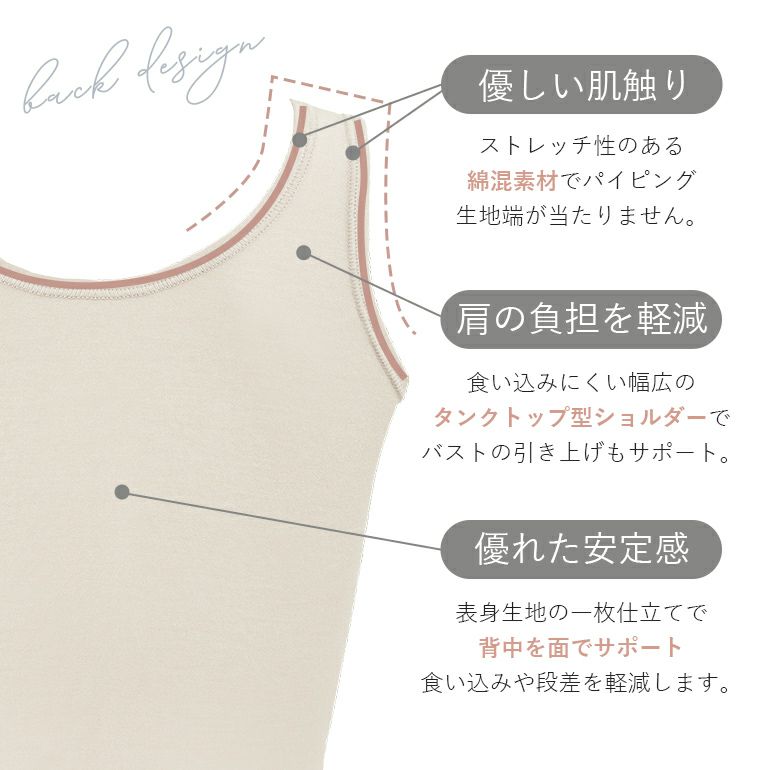 前身部分は、二重構造でお腹を押さえてすっきりシェイプ。伸縮性に優れているため、体の動きにフィットして楽な着心地です。背中は一枚仕立てのため、段差を軽減しなめらかに整えます。幅広ショルダーがバストの重みを面で支え、肩への負担を軽減します。