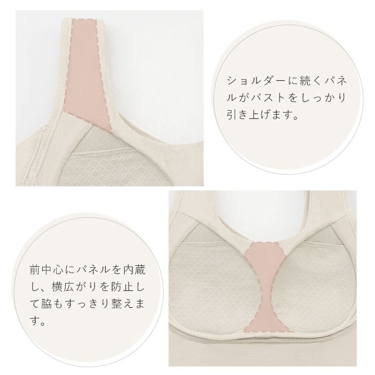 また、カップ周りに内蔵したパネルでバストの広がりを押さえて脇をすっきり整え、カップ全体を効果的に引き上げます。